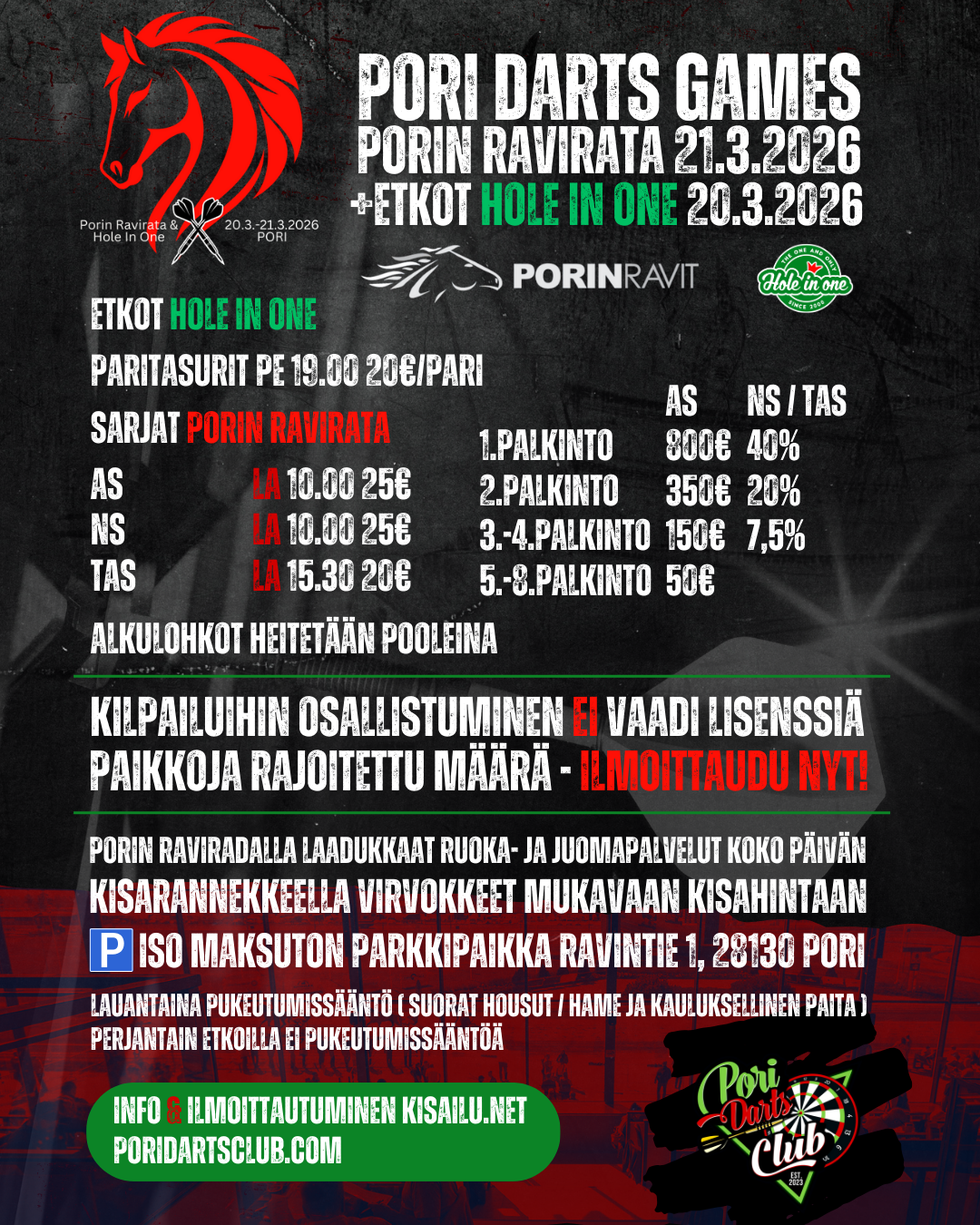 ajankohtaista PORI DARTS GAMES INFO VIIKKOKISAT DARTS ON KAIKILLE!HOLARIN VIIKKOKISOISSA EI PERITÄ OSALLISTUMISMAKSUA ALLE 18-VUOTIAILTA!
